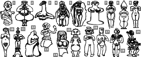 VII- Esculturillas femeninas que servirían para la autoestimulación y esculturilla femenina masturbándose: 1 y 2- De Dolní Vestonice / Unter-Wisternitz, Mikulov, Moravia, Checoslovaquia, 24000 adne. 3 y 4- De Mezine, Rusia, del año 18000 adne. 5 – De Bilcze Zlote, Rusia, del 8500 al 1700 adne. 6- Starcevo, Endröd-Szjóskereszt, Hungría, 5000 adne. 7- De Sireuil, Dordoña, Francia, 15000 adne. 8- De la Cueva del Pasquín, Vilhonneur, Charente, Francia, 15000 adne. 9- De Weinberg, Alemania ¿11000 adne?. 10- Del Lago Trasimeno, Italia, 20000 adne. 11 – De Nab Head St-Bride’s, Pembrokshire, País de Gales, Islas Británicas ¿5000 adne?. 12 y 13- De Extremadura, Iberia, Eneolítico (2500 adne hasta 1500 adne).14- Del Ática de la cultura Proto-Sesklo, Grecia ¿VII milenio adne?. 15- De Ubaid, Elam, ¿IV milenio adne?. 16 y 17- De yacimiento cercano al río Yarmuk, Canaán, 7000 adne. 18- De Senegal prehistórica, África. 19, 20 y 21- De Badari, cultura de Negada II, Egipto, año 3200 adne. 22- De la provincia de Mendi, isla de Nueva Guinea de Melanesia. 23- De sacerdotisa Bilian de Bali, Indonesia, del siglo XVIII.